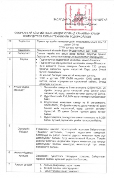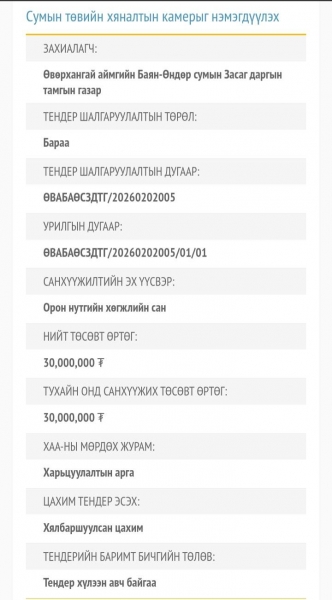 2026 оны орон нутгийн хөгжлийн сангийн 30.0 сая төгрөгийн санхүүжилтээр сумын төвийн хяналтын камерын тоог нэмэгдүүлж, ашиглалтыг сайжруулах, тендер зарлагдлаа.